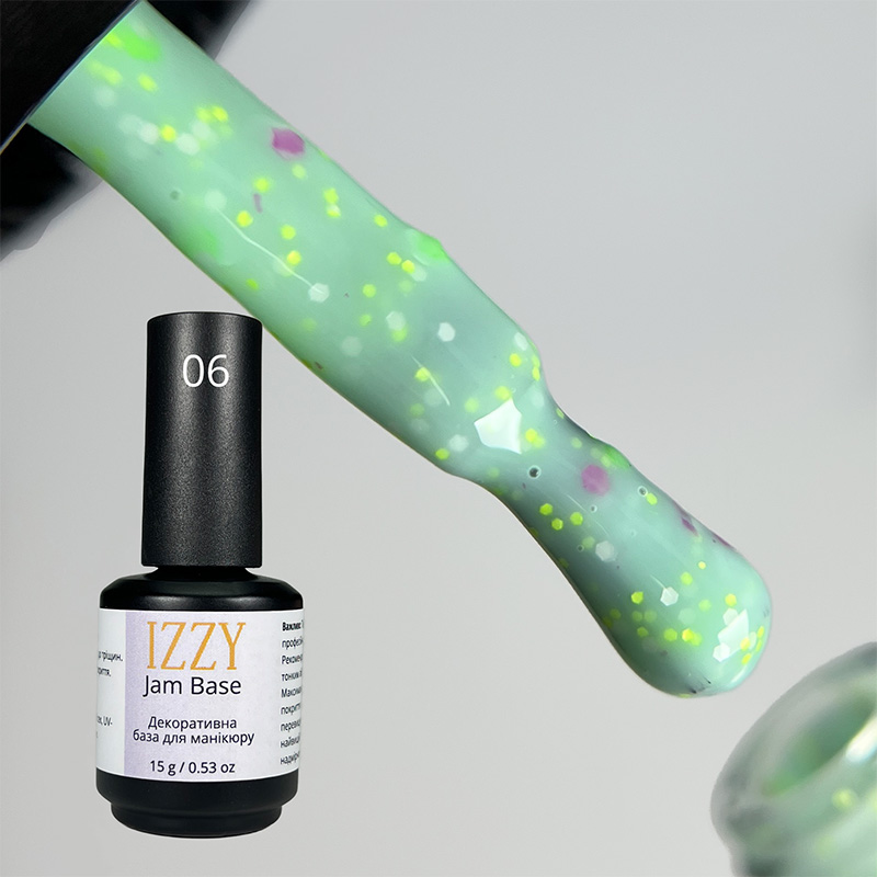 IZZY Jam Base 06 — база бірюзового кольору для манікюру, що містить всередині декоративні елементи. База має оптимальну пігментацію та добре перекриває нігтьову пластину в один вирівнюючий шар, залишаючи при цьому зону біля кутикули з м'яким переходом.