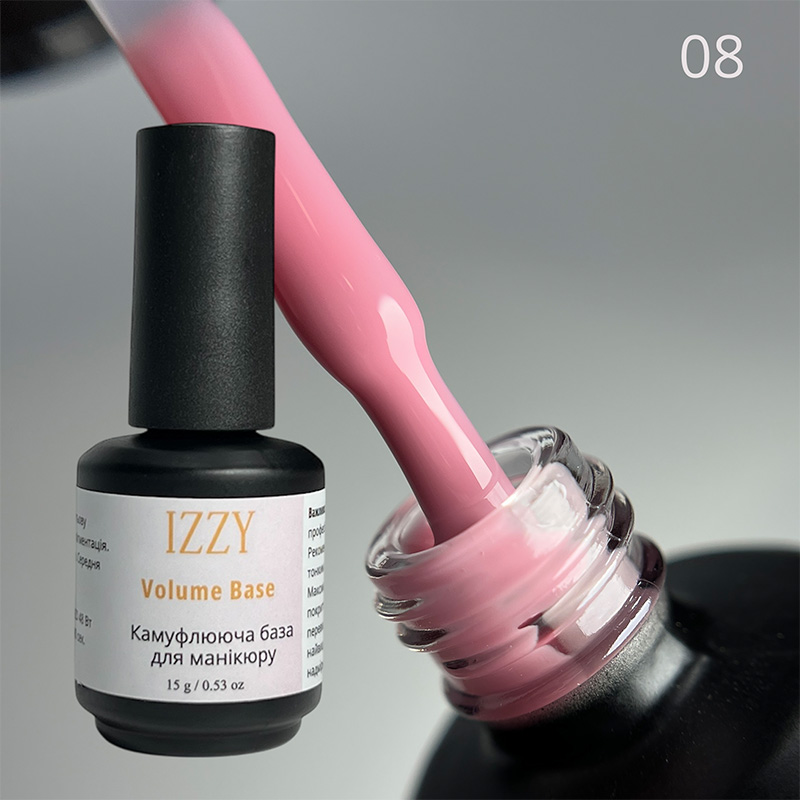 Камуфлююча база для нігтів Іззі Волюм номер 08 - рожевого кольору. Має помірно рідку консистенцію, а тому легко самовирівнюється. Армуючі властивості зміцнюють нігті.