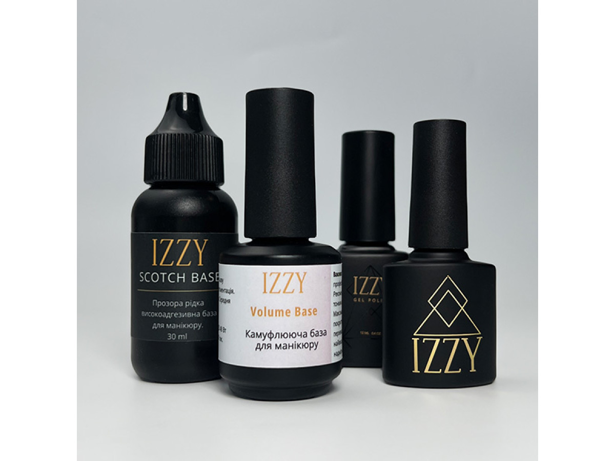 - IZZY Rubber Base — еластична підкладка що буде повторювати рухи нігтя, нанесення тонким шаром. Підходить у якості підкладки під усі види матеріалів - камуфлюючі бази, безадгезивні гелі та полігелі. IZZY Rubber Base можна використовувати як самостійну базу під кольорові гель-лаки, особливо при педикюрі, де збереження еластичності має велике значення.
