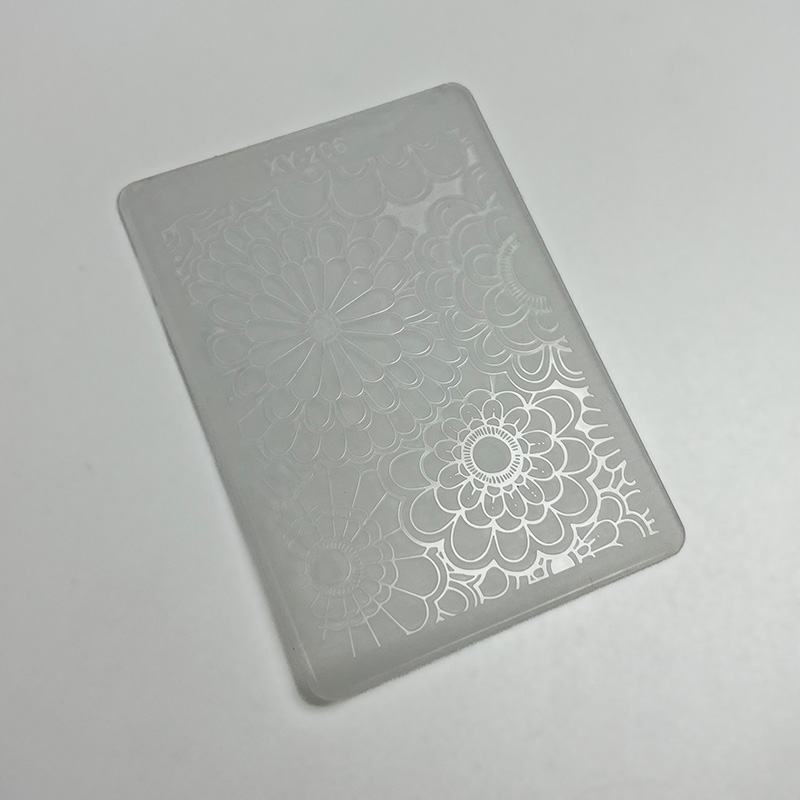 Пластиковий скребок, що має на собі гравірування з малюнком, який також можна використовувати як пластину для стемпінгу