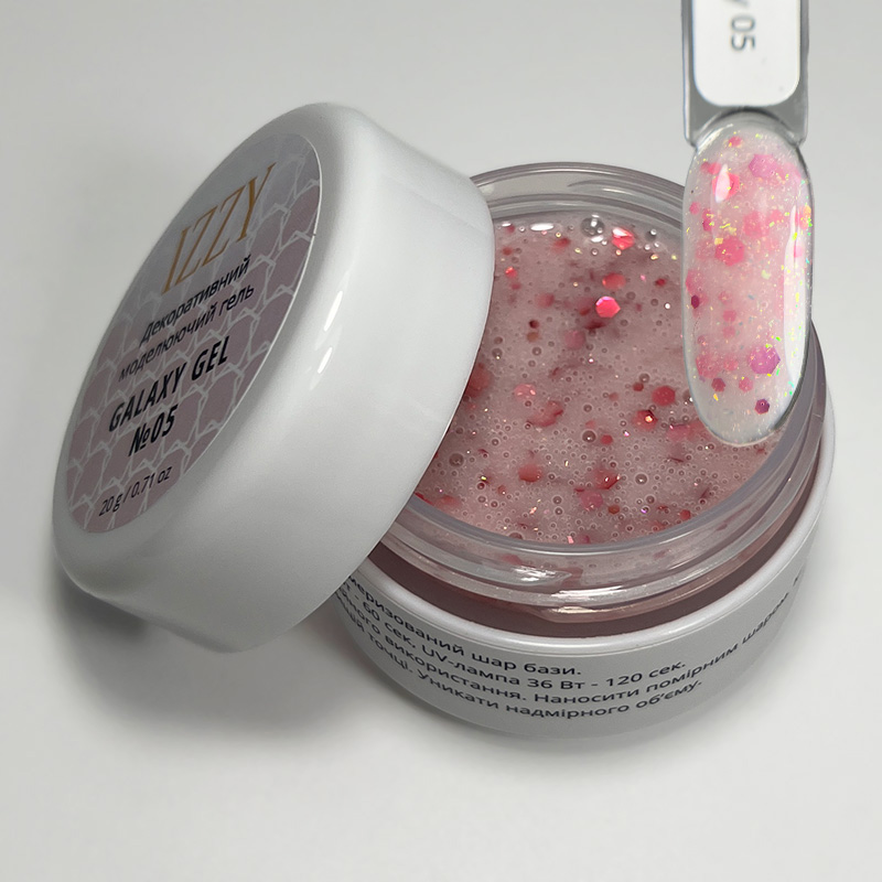 IZZY Galaxy Gel 05, 20 г — декоративний гель для моделювання чи зміцнення нігтів із глибоким 3D-ефектом та бензиновим переливом. Молочна основа гелю містить блискучі шестигранки та пластівці юкі, які додають покриттю візуальної глибини й об’єму.