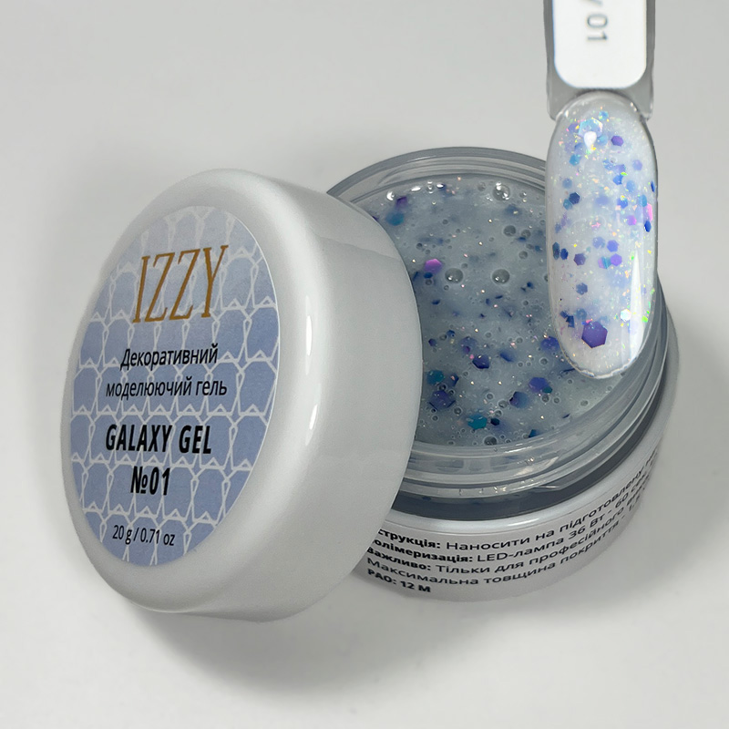 IZZY Galaxy Gel 01, 20 г — декоративний моделюючий гель для нігтів із глибоким 3D-ефектом та бензиновим переливом. Молочна основа гелю містить блискучі шестигранки та пластівці юкі, які додають покриттю візуальної глибини й об’єму.